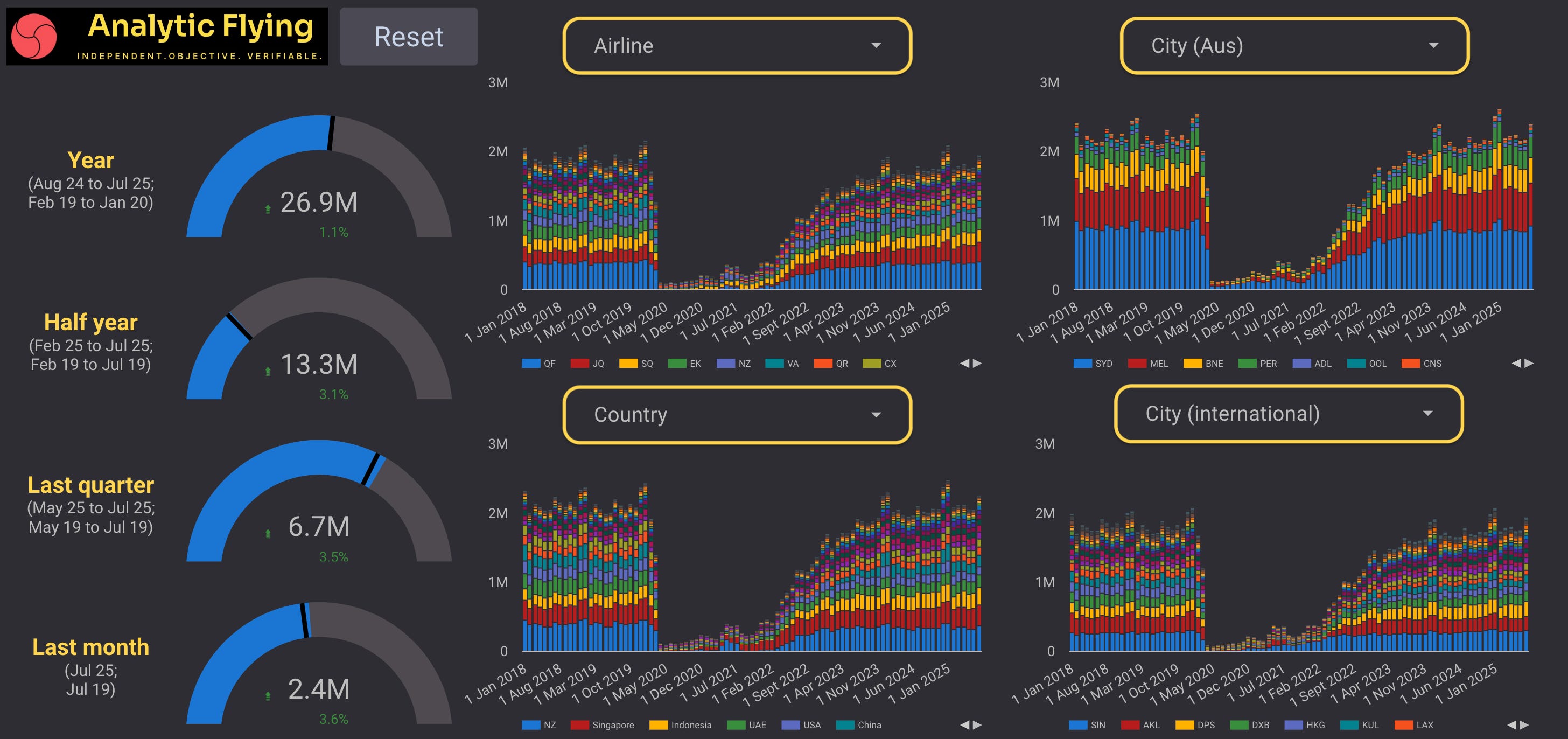 Analytic Flying’s capacity tracking tool tracks monthly international seat capacity to Australia (inbound seats as a proxy of total capacity). The user friendly dashboard, allows users to filter data by any combination of airline, Australian destination city and city and country origin. Data are updated to July 2025 (most recent BITRE release), with historical data from January 2018. Summary metrics show capacity and percentage change from the same month, quarter or half year prior to the COVID-19 pandemic, while the annual total shows the same compared to the last 12 months prior to the pandemic (i.e. January 2018). See the more detailed description of the history, data and methods below.