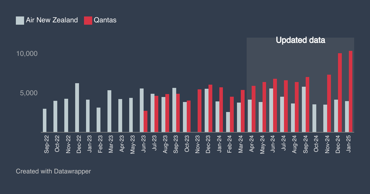 So how do the Air India and Qantas handle the seasonality? Interestingly, they approach it very differently with Qantas paying more attention to varying capacity throughout the year while Air India maintain consistent capacity. For example, Air India maintained consistent capacity between April 2022 and November 2023, reflecting daily B787-8 flights between Delhi and Melbourne/Sydney. Capacity increased in December 2023 as Mumbai-Melbourne was added. As we’ll see this isn’t a critique of Air India, but rather will highlight the different network approaches and strategies.