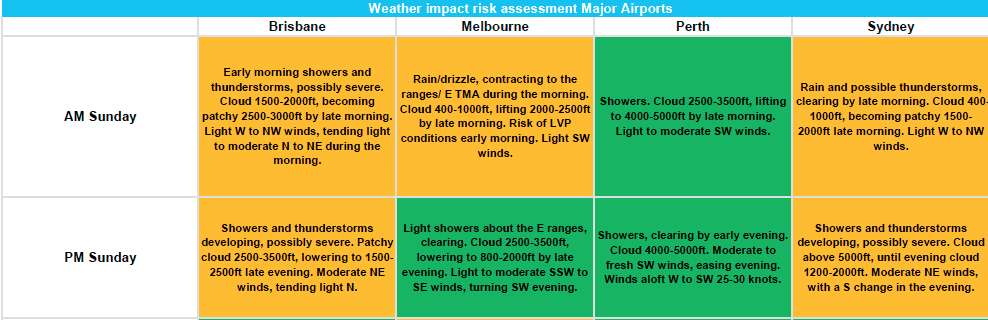 Poor weather was forecast on Sunday morning at Brisbane, Melbourne and Sydney, as highlighted in the daily ATFM plan published by Air Services Australia. The forecast wasn’t catastrophic, however it included the chance of thunderstorms at both Brisbane and Sydney. A particular challenge with thunderstorms is their localised impact, while their exact timing and location can be difficult to predict. This makes planning flights around thunderstorms difficult with a lot of uncertainty.