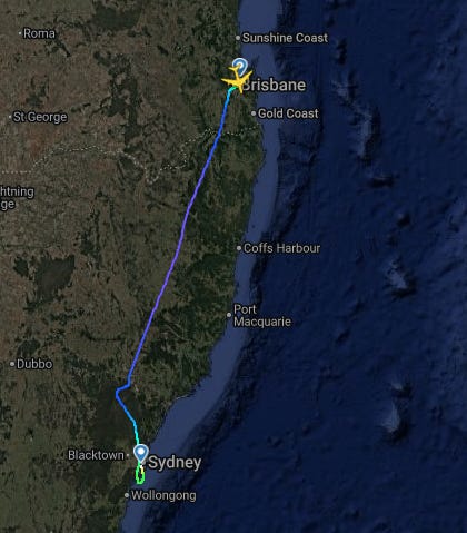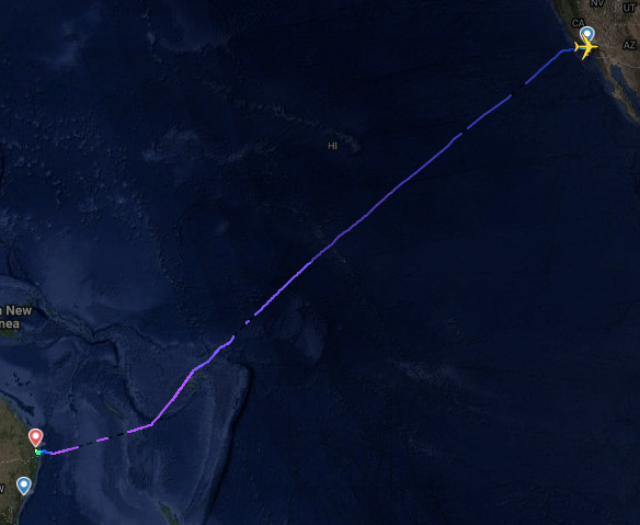 QF12 LAX-SYD, operated by an A380, diverted to BNE. Unlike QF22, this decision wasn’t planned ahead and a relative late decision was made a few hours out of SYD. This is obvious from the ADS-B data which shows the flight clearly heading to SYD.