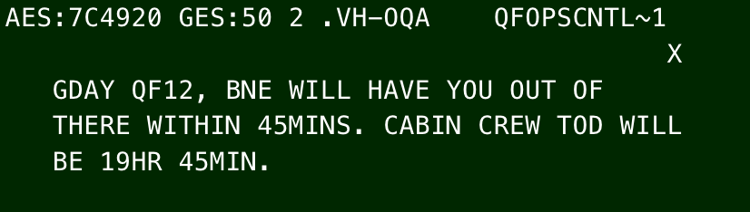 Once again, ACARS messages show s sense of urgency with ground crew prepped to hustle for 45 min splash and dash. That’s clearly aspirational since it was very unlikely to turn an A380 that quickly. Nevertheless, they managed to get out of BNE in time and made it to SYD a little over three hours late.